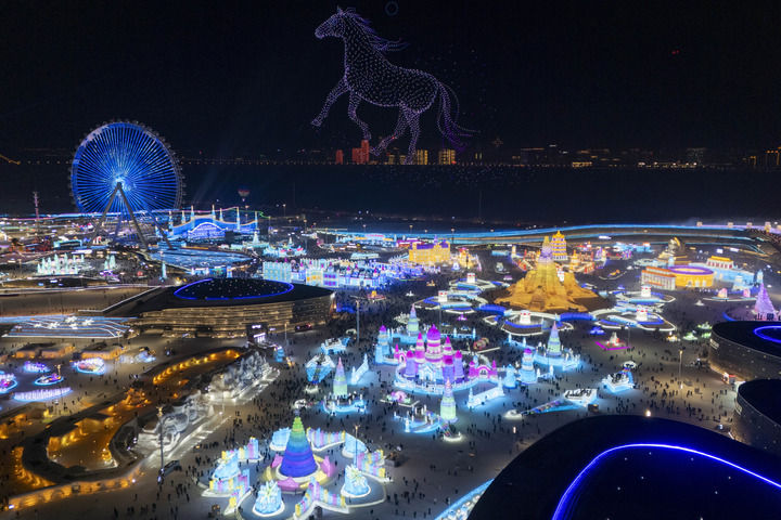這是2026年1月5日拍攝的哈爾濱冰雪大世界園區(qū)的無人機表演(無人機照片)。
