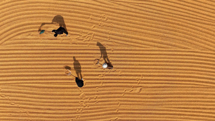 2025年10月28日,在山東省棗莊市市中區(qū)稅郭鎮(zhèn),農(nóng)民晾曬收獲的玉米(無人機照片)。