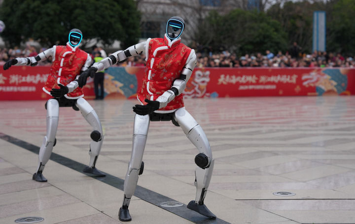 2026年2月28日,宇樹科技人形機器人在浙江省桐廬縣中心廣場表演舞蹈。