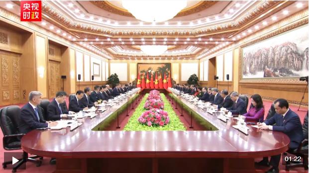 習(xí)近平指出,你當(dāng)選越南國家主席后第一時間到訪中國,體現(xiàn)了你對發(fā)展中越關(guān)系的高度重視。無論國際形勢如何變化,中方始終將越南作為周邊外交優(yōu)先方向,愿同越方秉持初心、賡續(xù)友誼,團(tuán)結(jié)協(xié)作、相互支持,高質(zhì)量推進(jìn)全面戰(zhàn)略合作,加快構(gòu)建更高水平具有戰(zhàn)略意義的中越命運(yùn)共同體。