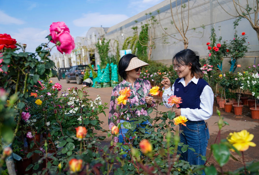 2025年4月11日,越南花商阮翠云(左)與翻譯李青歌在云南昆明斗南一花卉基地內(nèi)查看鮮花品質(zhì)。2018年,阮翠云開始在越南銷售云南花卉,讓七彩“云花”成為眾多越南家庭的“??汀?。借助高效的電商平臺(tái)和快捷的物流網(wǎng)絡(luò),鮮花從云南花田到河內(nèi)貨架實(shí)現(xiàn)了“次日達(dá)”。