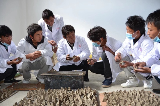 學(xué)校校長尼瑪次仁進行“傳統(tǒng)藏藥炮制工藝”實踐教學(xué)