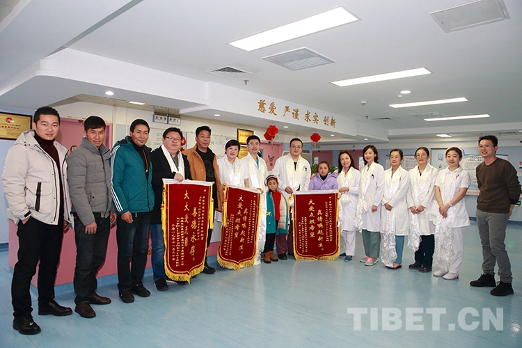 返鄉(xiāng)前,洛桑曲宗和次旦德吉在親屬和小學(xué)校長的帶領(lǐng)下來到兒研所,向醫(yī)護(hù)人員和共鑄中國心組委會的工作人員獻(xiàn)上了哈達(dá)和錦旗,表達(dá)感激之情。醫(yī)護(hù)人員也向兩個孩子贈送了書包等文具,鼓勵他們回校后好好學(xué)習(xí)。