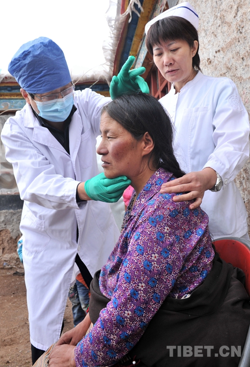 這是曾為斯求卓瑪進行手術的北京口腔醫(yī)院頭頸腫瘤科主任韓正學(左)到藏北上門為斯求卓瑪做術后檢查。(唐召明2015年7月14日攝)
