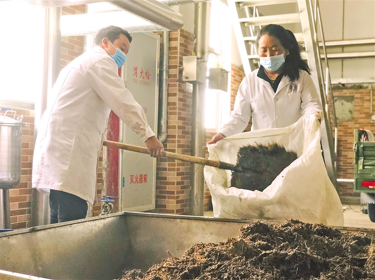 西藏自治區(qū)藏醫(yī)院藏醫(yī)藥浴中心工作人員在清理藥材提取后的藥渣。