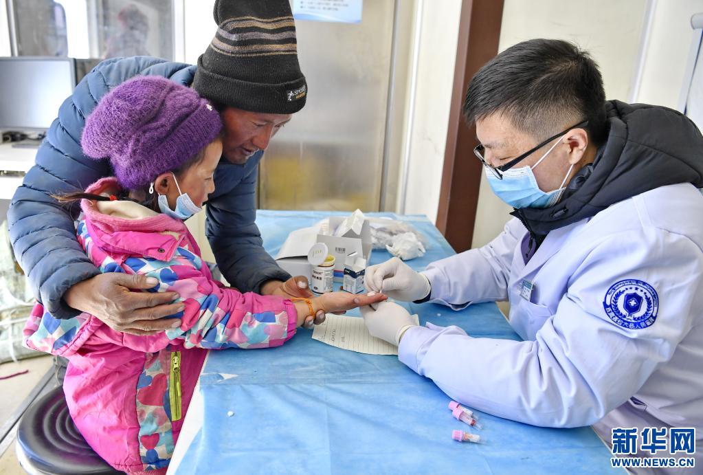 4月20日,在巡診車上,山東省煙臺市第五批援藏醫(yī)療隊醫(yī)生焦有誠(右)為亞來鄉(xiāng)歐熱村村民采血檢驗。新華社記者 張汝鋒 攝
