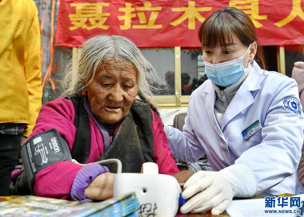 4月20日,山東省煙臺市第五批援藏醫(yī)療隊成員崔雯(右)為亞來鄉(xiāng)歐熱村村民測量血壓。新華社記者 張汝鋒 攝