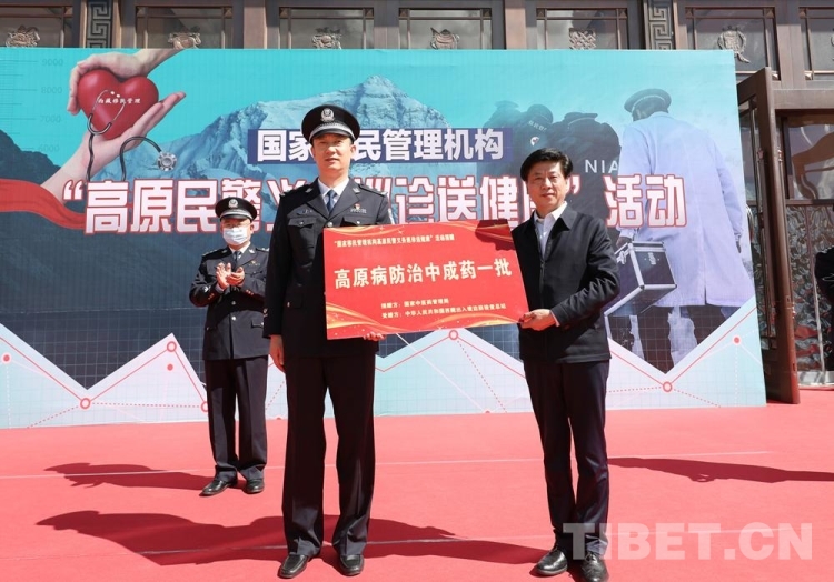 圖為“高原民警義務(wù)巡診送健康”活動啟動儀式上,國家中醫(yī)藥管理局為西藏出入境邊防檢查總站贈送一批高原病防治中成藥。 攝影:何宇恒
