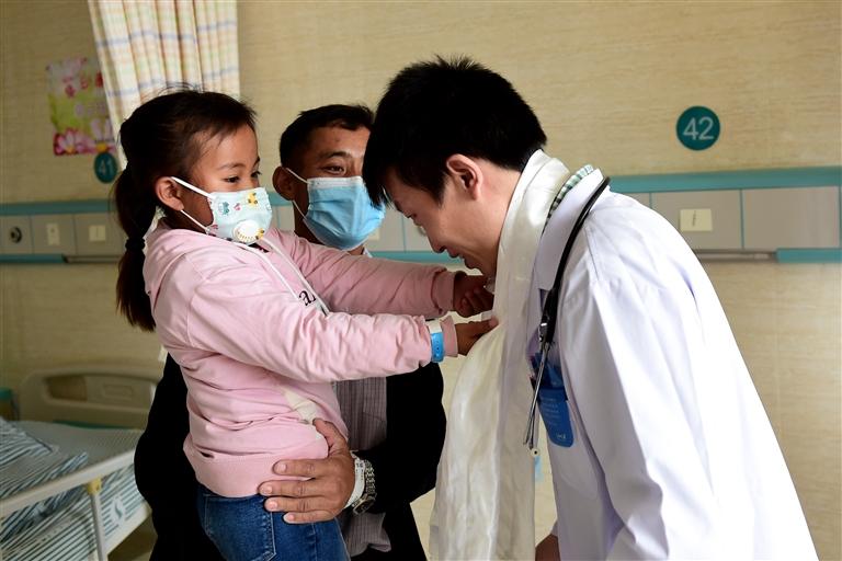 患兒(左一)在家長(zhǎng)陪同下向主治醫(yī)師車(chē)轟獻(xiàn)哈達(dá)表示感謝。黃博涵 攝