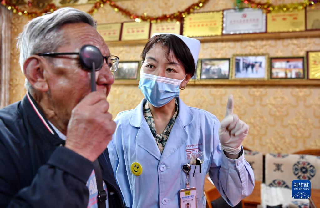 5月9日,醫(yī)務(wù)人員為八廓社區(qū)的居民檢查眼睛。新華社記者 張汝鋒 攝