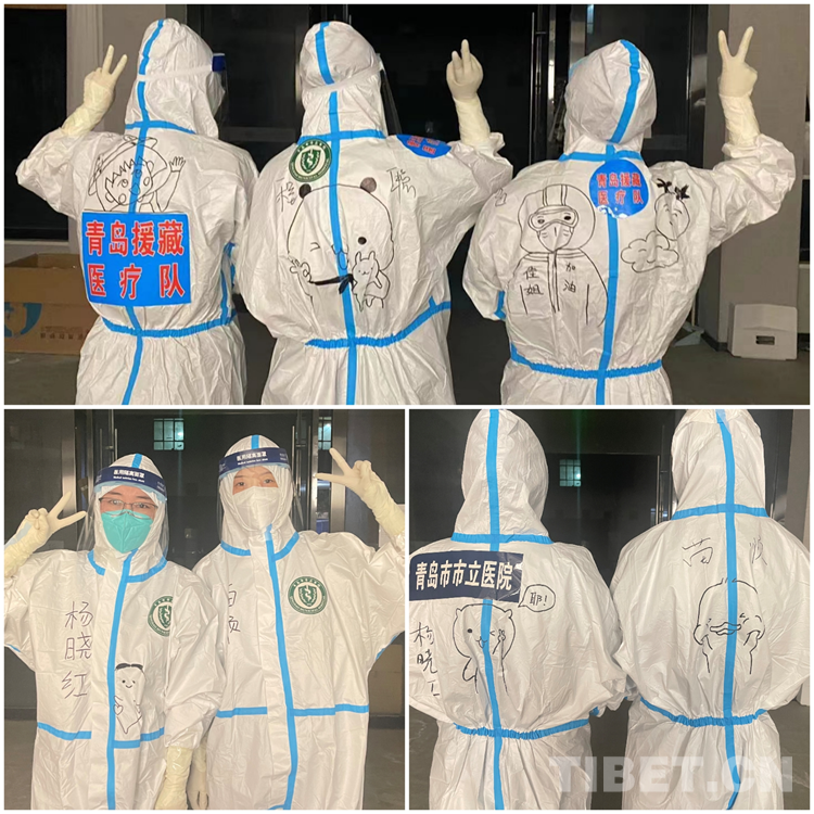 圖為青島“大白”們身著漫畫“戰(zhàn)袍”在日喀則戰(zhàn)“疫”一線合影留念