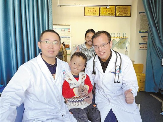 援藏醫(yī)療隊(duì)廖森成醫(yī)生與前來篩查的兒童合影。