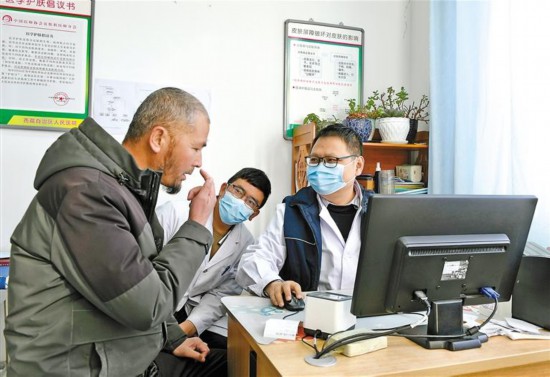 中國醫(yī)學(xué)科學(xué)院皮膚病醫(yī)院援自治區(qū)人民醫(yī)院醫(yī)生李鎖(右一)與本地醫(yī)生一起問診。記者 旦增蘭澤 攝