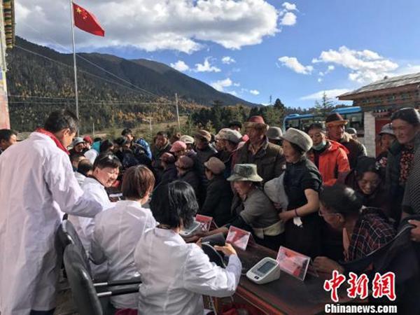 圖為援藏醫(yī)生為林芝農(nóng)牧民義診贈(zèng)藥。圖片來(lái)源:中新網(wǎng) 攝影:張寧