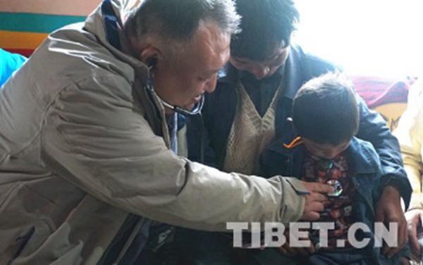 圖為北京安貞醫(yī)院心臟外科中心主任醫(yī)師趙鐵夫?yàn)橐呀邮苁中g(shù)的先心病患兒旦增羅布聽(tīng)診 攝影:吳建穎