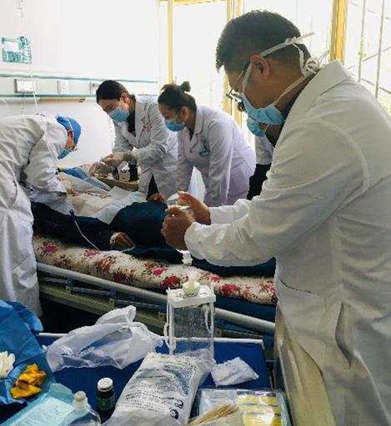 有一次,與解放軍920醫(yī)院為藏族群眾旺加聯(lián)合開展右脛骨骨折切開復位內固定術時,手術室沒有C臂透視機,凳子數(shù)量不夠,只能憑借臨床經驗半蹲著馬步操作。高原反應給身體帶來強烈的不適,隊員們在3個多小時的手術時間里幾乎全程帶著氧氣,哪怕出現(xiàn)頭暈低血糖反應,仍努力堅持到最后。手術結束后,因為醫(yī)院電梯故障,隊員們又不顧身體的疲累,將患者旺加從2樓手術室抬到1樓病房。旺加的女兒每次見到醫(yī)療隊員查房、換藥時,都會用漢語叫叔叔、阿姨,并拽著隊員們白大褂的衣角說“謝謝”。