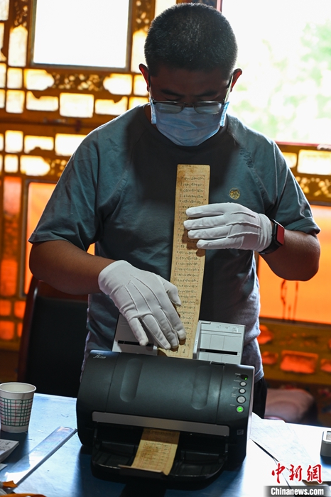 圖為6月27日,拉薩,西藏自治區(qū)藏醫(yī)院文獻研究所工作人員掃描古籍。 中新社記者 趙朗 攝