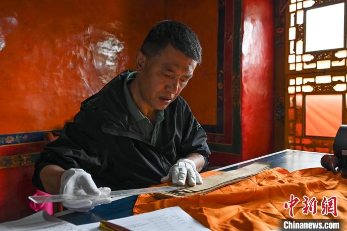 圖為6月27日,拉薩,西藏自治區(qū)藏醫(yī)院文獻研究所相關(guān)負責人次旦平措對交接而來的古籍檢查測量尺寸。 中新社記者 趙朗 攝