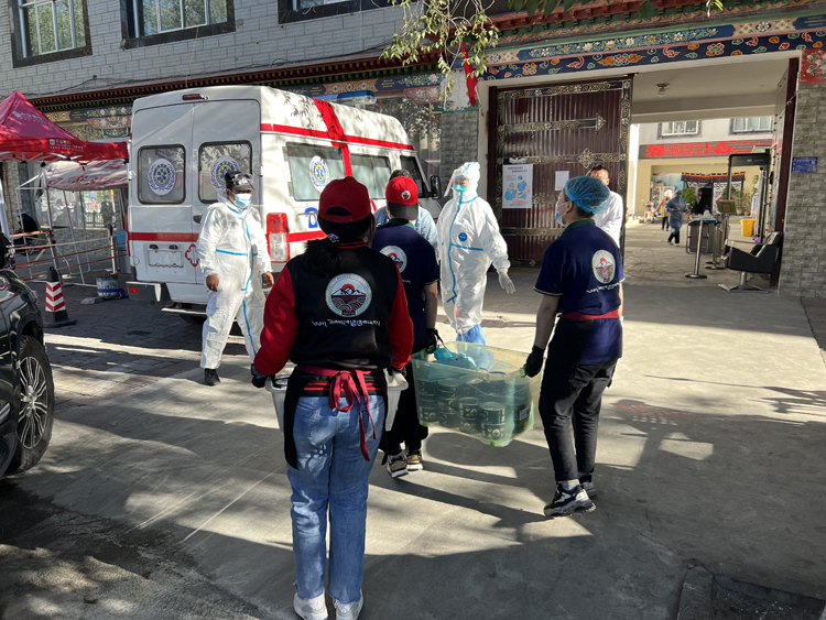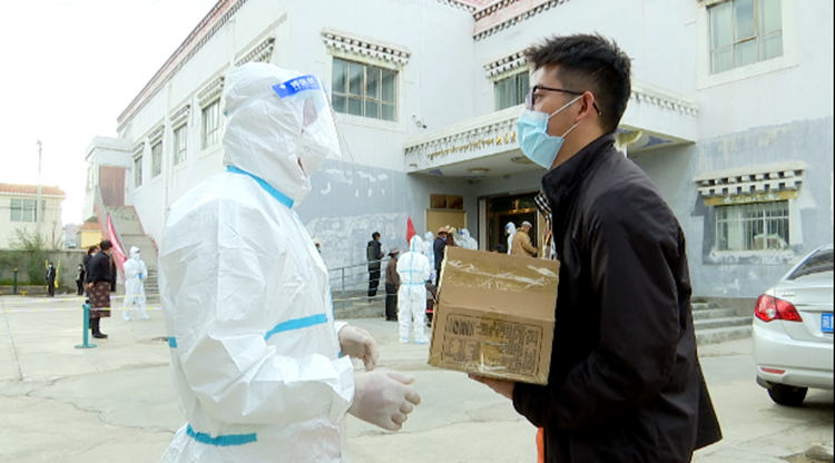 圖為阿里地區(qū)噶爾縣獅泉河鎮(zhèn)“五餡包”餐飲店工作人員把愛(ài)心早餐送到抗疫一線工作人員手中
