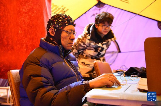 在卓奧友峰登山大本營(yíng),中科院院士朱彤佩戴全腦彈性測(cè)試帽,測(cè)試人體認(rèn)知能力(10月1日攝)。新華社記者 晉美多吉 攝