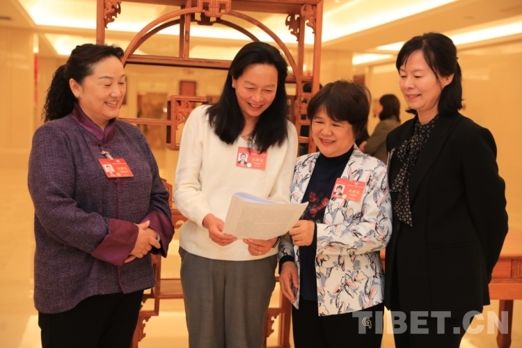 圖為全國兩會期間,界別小組會議時,花德米(左二)與其他委員學(xué)習(xí)會議文件