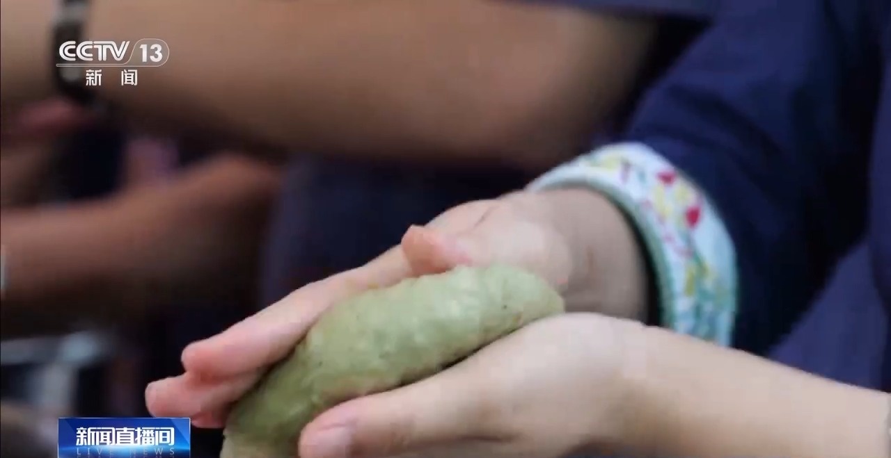 加入新鮮石斛汁液的糯米飯變得又香又糯,在一雙雙巧手里變成一張張綠色餅皮,包上豆沙餡料,外面再裹上香脆的蘇子,一個(gè)糯香四溢的石斛霜降粑就做好了。
