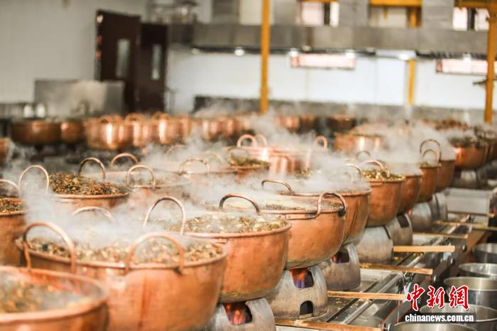 7日,岳陽(yáng)醫(yī)院膏方制作室內(nèi),100口紫銅鍋的爐火熊熊燃燒。(岳陽(yáng)醫(yī)院供圖)
