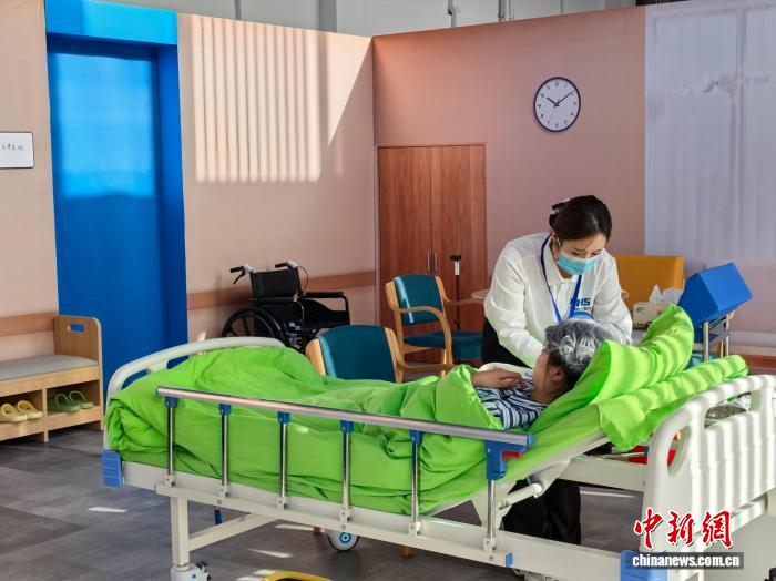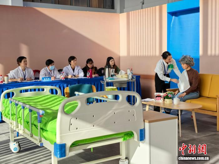 記者看到,競賽現(xiàn)場設(shè)置了居家照護和機構(gòu)照護兩個場景。每個場景中都涉及生活照護、疾病護理和心理照護模塊。