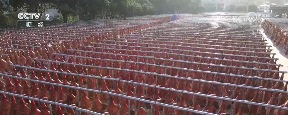 如今,曬火腿也成為金華冬日的一道靚麗風(fēng)景。在這家百年火腿廠,數(shù)萬(wàn)只形如琵琶的火腿整齊懸掛,工人們穿梭其間,為火腿進(jìn)行翻曬、塑形,確保每只火腿都能均勻接受陽(yáng)光的洗禮。