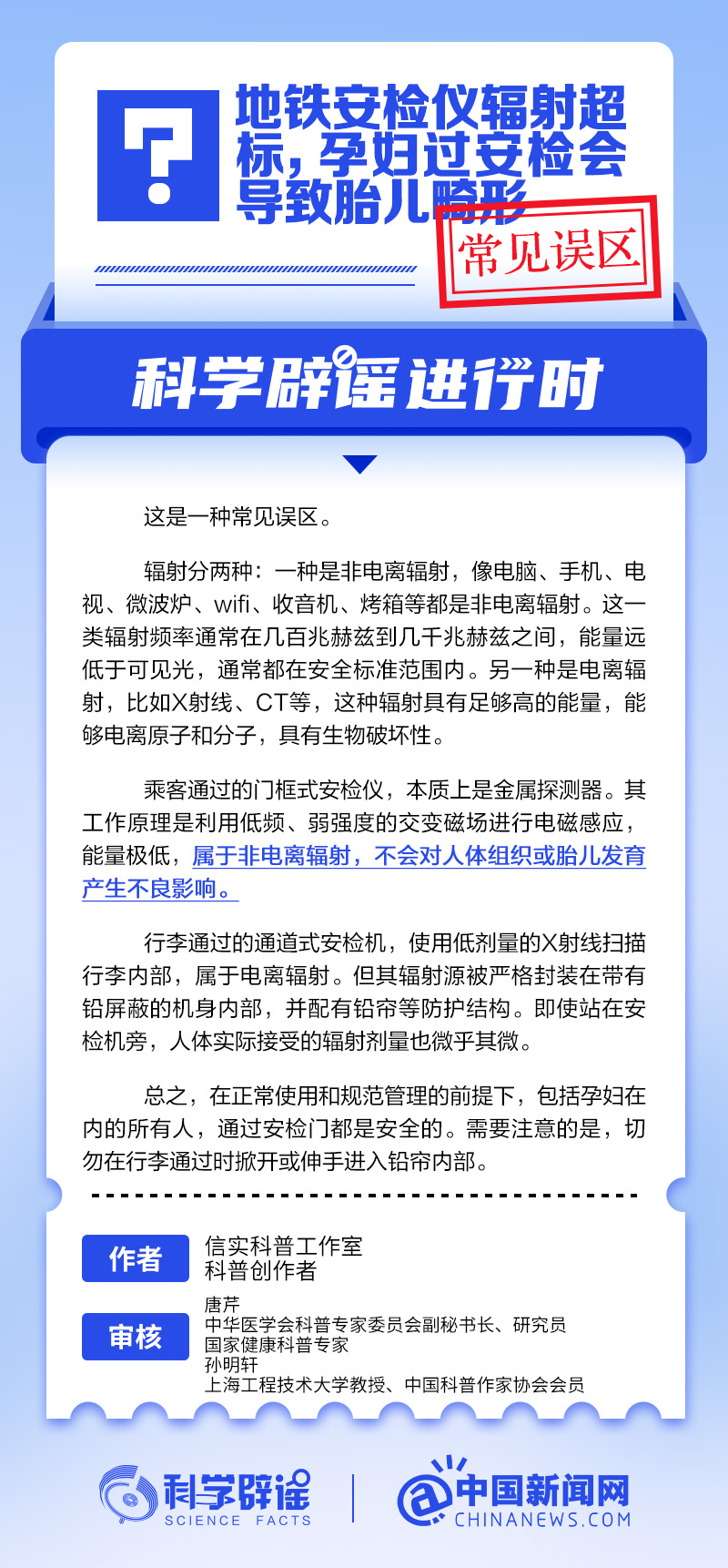乘客通過的門框式安檢儀,本質(zhì)上是金屬探測器。其工作原理是利用低頻、弱強(qiáng)度的交變磁場進(jìn)行電磁感應(yīng),能量極低,屬于非電離輻射,不會對人體組織或胎兒發(fā)育產(chǎn)生不良影響。行李通過的通道式安檢機(jī),使用低劑量的X射線掃描行李內(nèi)部,屬于電離輻射。但其輻射源被嚴(yán)格封裝在帶有鉛屏蔽的機(jī)身內(nèi)部,并配有鉛簾等防護(hù)結(jié)構(gòu)。即使站在安檢機(jī)旁,人體實(shí)際接受的輻射劑量也微乎其微。在正常使用和規(guī)范管理的前提下,包括孕婦在內(nèi)的所有人,通過安檢門都是安全的。(來源:@科學(xué)辟謠 中國新聞網(wǎng)微博)