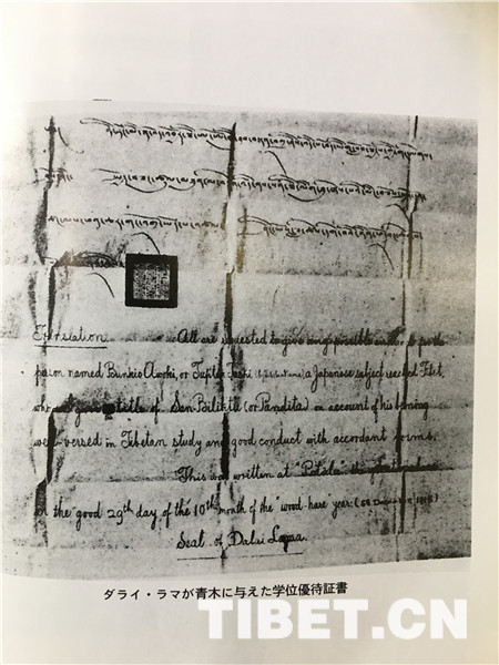再說青木進(jìn)入西藏不久,派他入藏的西本愿寺在財(cái)政方面逐漸陷入困境,因此于1914年,大谷光瑞辭去了法主職務(wù),西本愿寺方面也向青木文教發(fā)出了歸國(guó)的命令。雖然青木很不舍在拉薩愜意的留學(xué)生活,但也不得不從命歸國(guó)。臨歸國(guó)前的1916年1月23日,青木在羅布林卡受到了達(dá)賴?yán)锏恼僖姡_(dá)賴授給他“班智達(dá)”的稱號(hào),并發(fā)給蓋有達(dá)賴印章的證書。達(dá)賴鼓勵(lì)他以后繼續(xù)學(xué)習(xí),并為西本愿寺與西藏的關(guān)系更加緊密和實(shí)現(xiàn)“日藏親善”而努力。