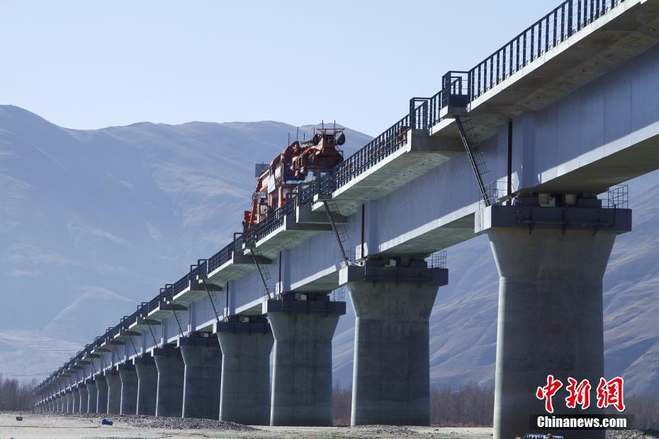 11月26日,中鐵十一局三公司拉林鐵路項(xiàng)目部鋪架二隊(duì)工人鋪設(shè)拉林鐵路首跨貢嘎雅魯藏布江特大橋鐵軌。拉林鐵路共計(jì)上跨雅魯藏布江16處,貢嘎雅魯藏布江特大橋全長(zhǎng)5727米,為拉林鐵路全線最長(zhǎng)橋梁。拉林鐵路起于西藏自治區(qū)首府拉薩,終點(diǎn)為林芝市,拉林鐵路新建正線鋪軌403.14千米,運(yùn)營(yíng)長(zhǎng)度435.48千米。圖為部分鐵路已經(jīng)鋪設(shè)完成。中新社記者 趙朗 攝
