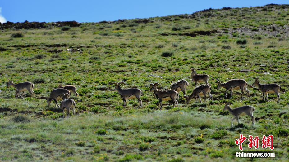 9月2日,多只藏原羚和巖羊在西藏山南羊卓雍錯湖畔覓食。當?shù)亟陙聿粩嗉哟蟊Wo力度,環(huán)境日益趨好,野生動物種群正在逐漸恢復、增長。中新社記者 江飛波 攝