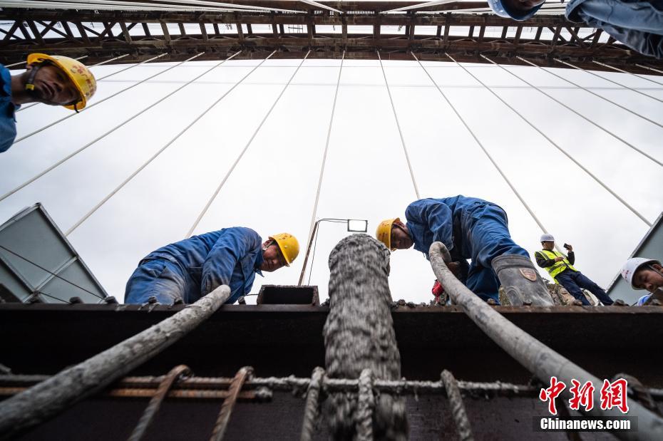 6月20日,中鐵廣州工程局工人在位于西藏自治區(qū)加查縣的藏木特大橋工地進行混凝土澆筑作業(yè)。中新社記者 何蓬磊 攝