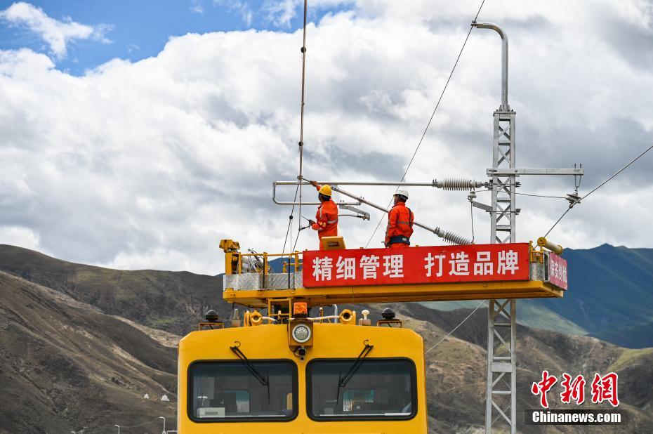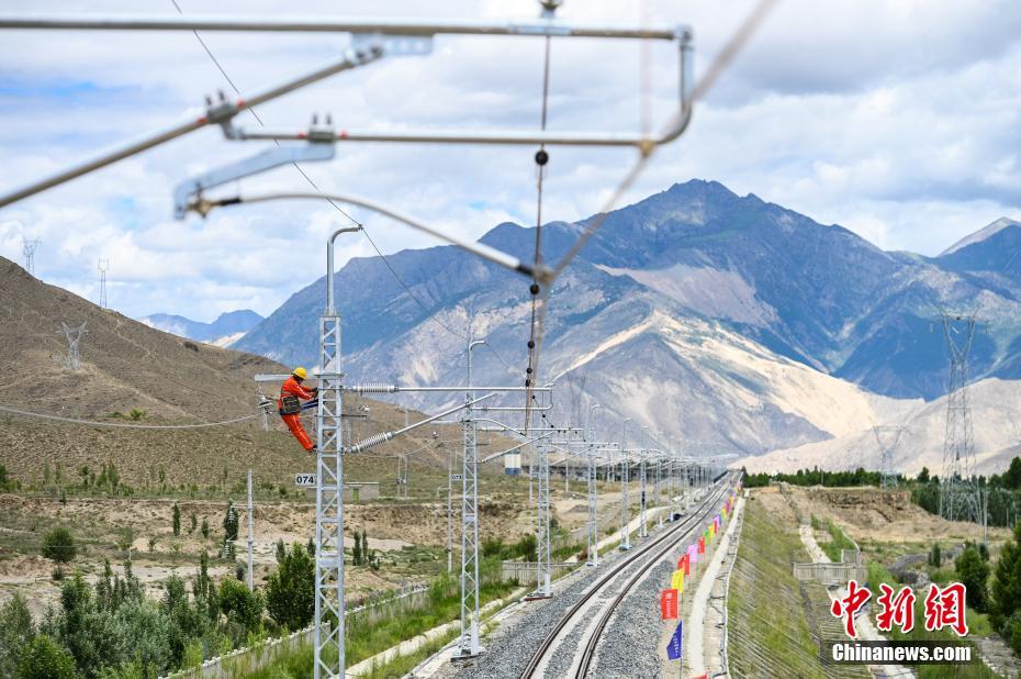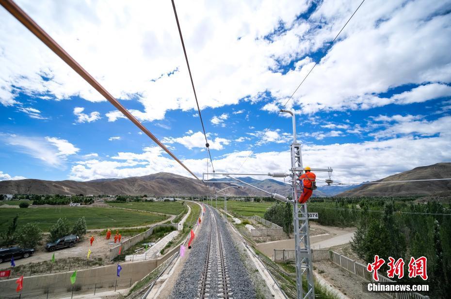7月6日,中國中鐵電氣化局施工人員對拉林鐵路接觸網(wǎng)專業(yè)首件工程進(jìn)行復(fù)檢。當(dāng)日,川藏鐵路拉薩至林芝段(簡稱“拉林鐵路”)接觸網(wǎng)專業(yè)首件工程在西藏山南市扎囊至扎其區(qū)間成功建成,這為全線施工確定了規(guī)范和標(biāo)準(zhǔn),至此拉林鐵路也進(jìn)入了全線電氣化大規(guī)模施工階段。 拉林鐵路正線全長435.48公里,是西藏首條電氣化鐵路,正線共需架設(shè)接觸網(wǎng)540.63條公里,設(shè)計(jì)時速160公里。中新社記者 何蓬磊 攝
