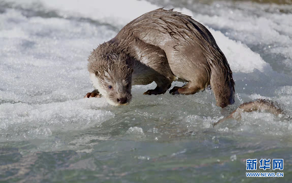 一只歐亞水獺在水中游動(dòng)。新華網(wǎng)發(fā)(文德 攝)