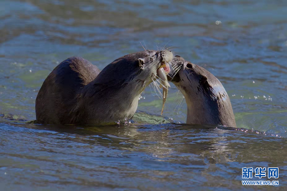兩只歐亞水獺在扎曲河畔嬉戲。新華網(wǎng)發(fā)(文德 攝)