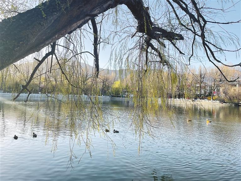春風(fēng)不僅化開了宗角祿康的湖水,也化開了這座高原古城一整個(gè)寒冬的倦懶。柳樹吐露出稚嫩的樹芽,成群的赤麻鴨、斑頭雁浮游在湖中,享受著“紅掌撥清波”的悠閑……