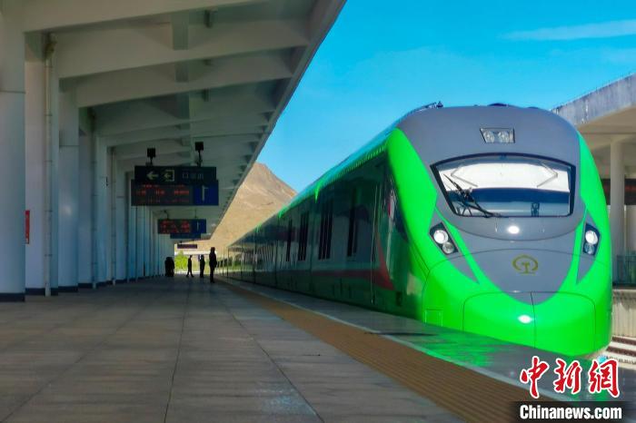2023年3月21日,西藏林芝市巴宜區(qū)蜿蜒的鐵路線上,一列復(fù)興號列車穿越盛開的山桃花花海。劉玉才攝(人民圖片網(wǎng))