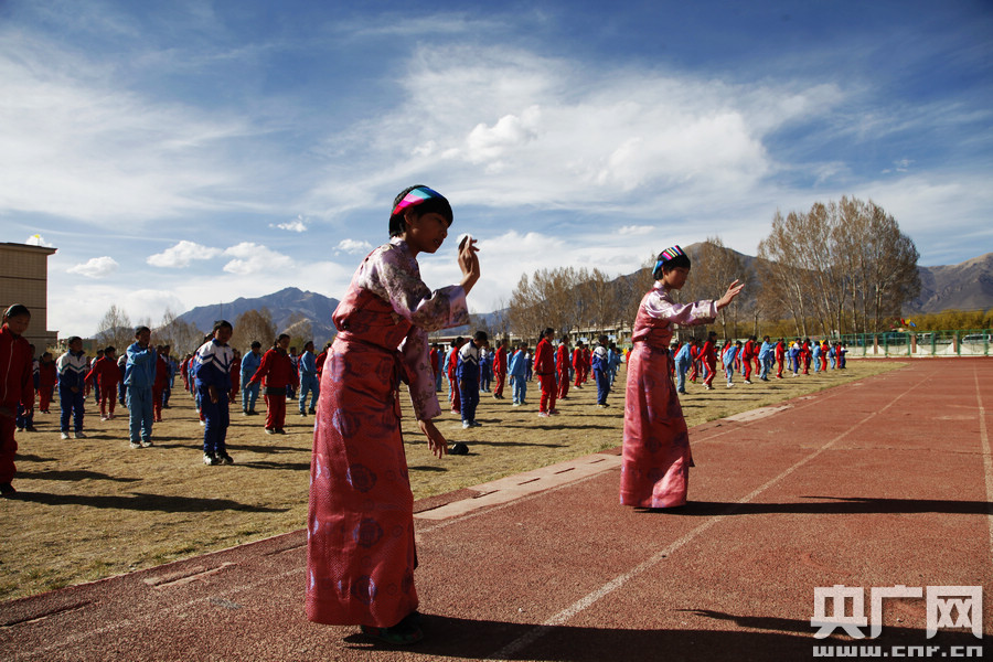 山南素有“果諧之鄉(xiāng)”的美稱,該市扎囊縣的“扎囊果諧”曲調(diào)獨(dú)具特色,激情熱烈,具有很強(qiáng)的感染力,2006年被列入西藏自治區(qū)非物質(zhì)文化遺產(chǎn)名錄。為更好地傳承這一民間舞蹈,扎囊縣從2013年開始在校園推廣這種新式課間操。圖為兩名藏族女孩帶領(lǐng)數(shù)百名扎囊縣中學(xué)學(xué)生跳起“果諧舞”課間操。圖片來源:央廣網(wǎng)