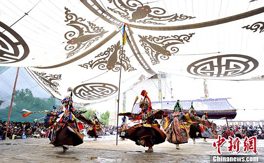 由于藏傳佛教的影響,很多藏文化帶有宗教色彩。在藏族舞蹈中,“羌姆”(俗稱 “跳神”)屬于最為重要的宗教類別寺院祭祀性舞蹈。每逢重大宗教節(jié)日,西藏僧侶們便穿起彩袍,戴上面具,佩彩帶和刀盾,伴著牛角號(hào)、嗩吶等樂器跳起威武莊嚴(yán)的“羌姆”。圖為山南地區(qū)桑耶寺僧人 “羌姆”表演。圖片來源:中新網(wǎng)