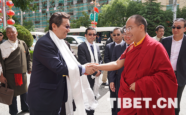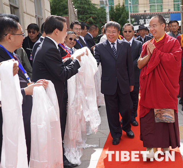 十一世班禪與前來迎接的山南市有關(guān)領(lǐng)導握手致意。攝影:王淑