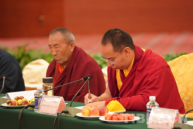 圖為十一世班禪認真聆聽山南市宗教界代表人士發(fā)言,并不時記錄。攝影:王淑
