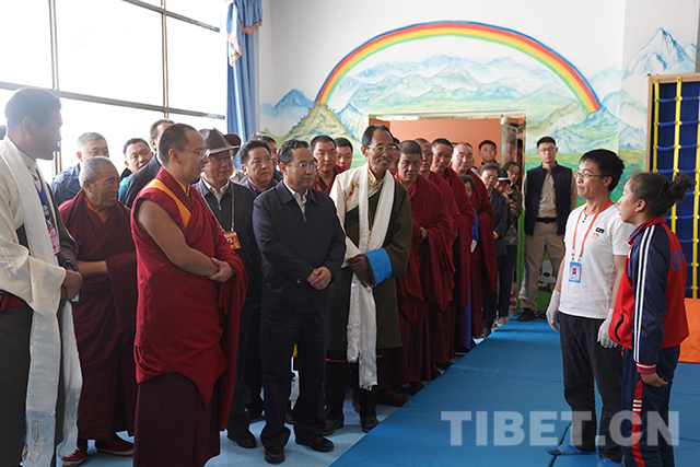 看望完殘障學(xué)生后,十一世班禪又來(lái)到山南市兒童福利院,看望在這里生活的山南市和那曲市部分孤兒。本著“一心想著孩子,一切為了孩子”的理念,福利院為460多名孩子提供了室內(nèi)外活動(dòng)室、電教室、圖書(shū)室、美術(shù)室、成長(zhǎng)教育園地、舞蹈室、藏文書(shū)法室等,孩子們可以在這里學(xué)習(xí)文化、增長(zhǎng)見(jiàn)識(shí)。