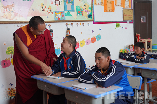 圖為十一世班禪仔細(xì)查看殘疾學(xué)生學(xué)習(xí)情況。攝影:扎西