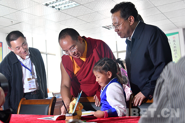 圖為十一世班禪在圖書(shū)室了解孩子們的學(xué)習(xí)情況。攝影:扎西