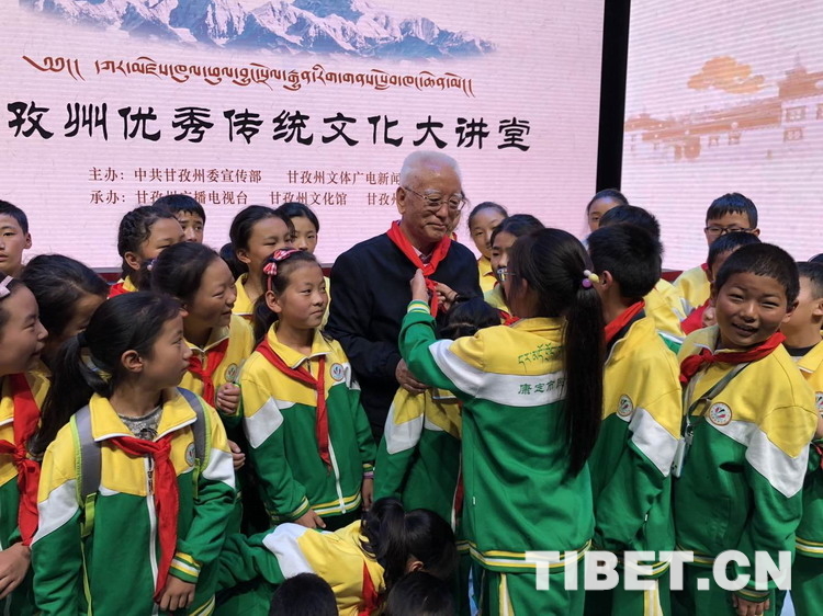 圖為現(xiàn)場(chǎng)小聽(tīng)眾為主講人降邊嘉措系上紅領(lǐng)巾。圖片由甘孜電視臺(tái)提供