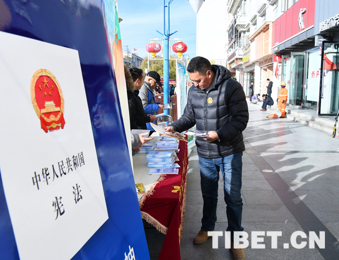 圖為12月5日,在拉薩市宇拓路,一位市民在西藏自治區(qū)氣象局憲法宣傳展臺前認(rèn)真翻看法治宣傳資料。