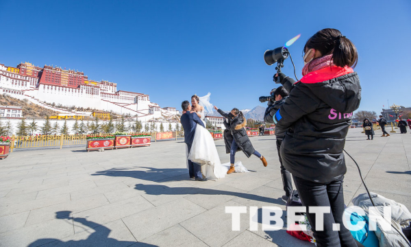 冬日的布達(dá)拉宮廣場(chǎng)上,身著盛裝的市民群眾三三兩兩的有說有笑;前來旅游的游客拉著行李箱漫步其中;不畏嚴(yán)寒拍攝婚紗照的新人露出甜蜜的笑容。