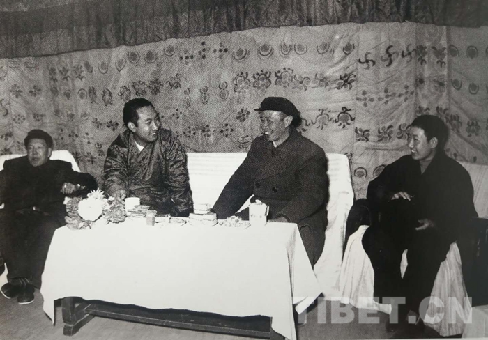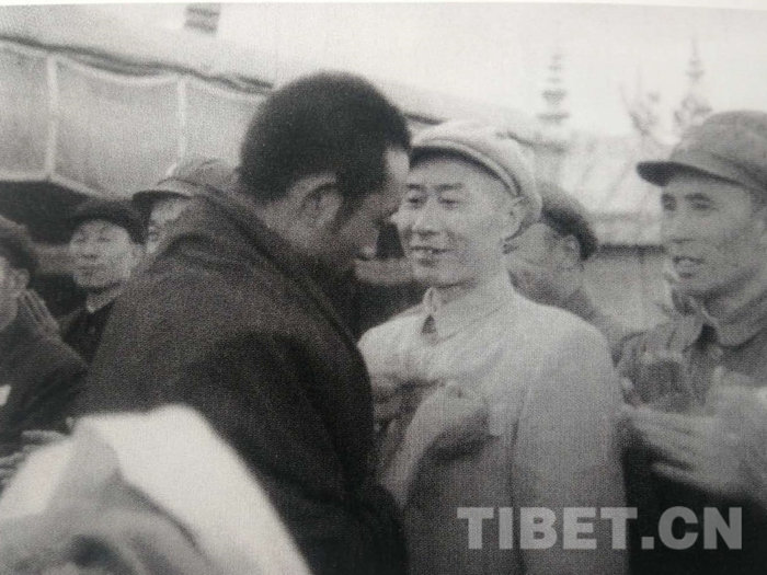 1952年4月28日,十世班禪額爾德尼?確吉堅(jiān)贊及其堪布會(huì)議廳委員會(huì)全體人員從青海返回西藏,到達(dá)拉薩。張經(jīng)武和人民解放軍駐拉薩機(jī)關(guān)、部隊(duì)、西藏地方政府各級(jí)官員、西藏地方部隊(duì),三大寺喇嘛、拉薩市僧俗群眾等兩萬多人迎接。圖為張經(jīng)武和十世班禪的合影。